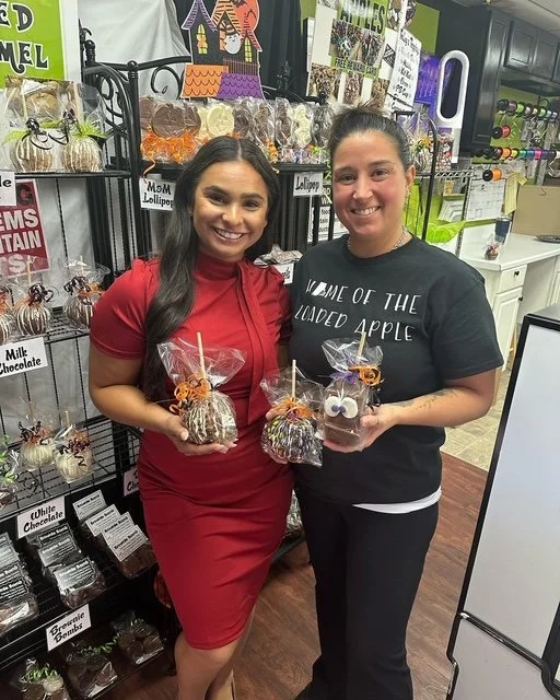 Krystin Rae of NBC 10, Providence showcasing Alicia’s famous loaded Apple at her store front on Mineral Spring Ave in North Providence